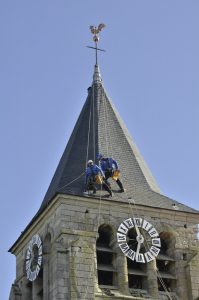 Les cordistes à l’assaut du clocher de Brenouille (Oise). Ce lundi 30 octobre 2 cordistes Loïs et Romain de la société Expérience cordiste sont montés sur le toit de l’église de Brenouille pour réparation de la couverture en ardoises.